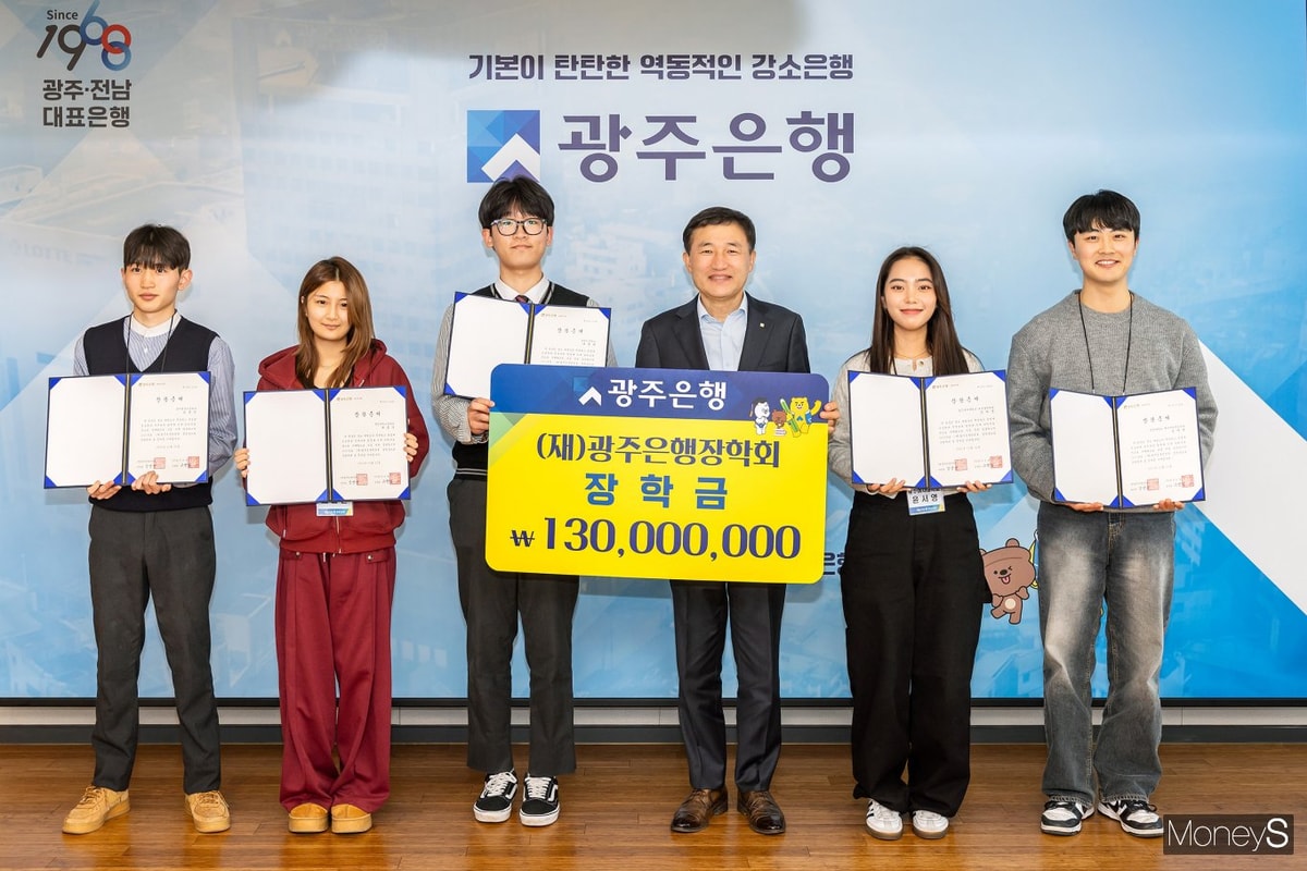 고병일 광주은행장(오른쪽 세번째)이 광주·전남 출신 장학생 대표 5명에게 장학금을 전달하고 있다/사진=광주은행 제공.