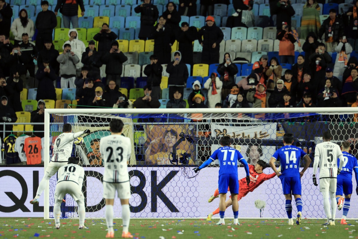 제주는 후반 30분 후방 침투 패스로 기회를 잡았다. 골키퍼 김민준은 가슴으로 볼을 잡은 유인수에게 날아 차기에 가까운 몸통 박치기를 날려 페널티킥을 허용했다. 키커로 나선 조나탄은 타이밍을 완벽히 뺏으며 우측 상단을 정확히 노려 선제골을 터트렸다.