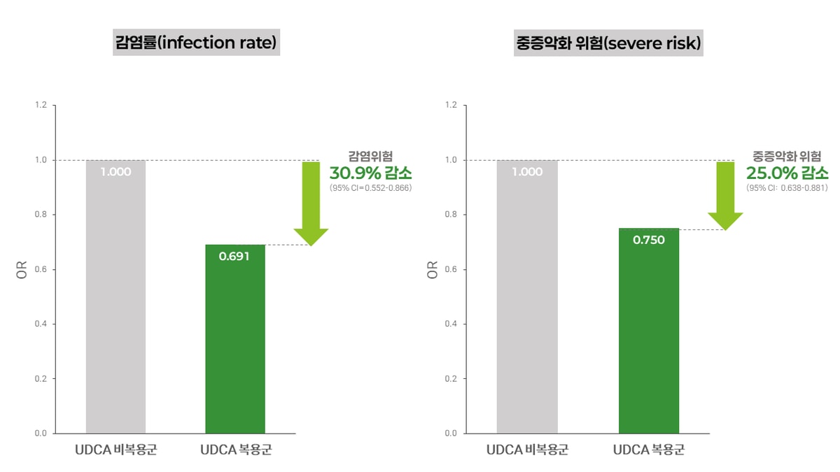 건양대학교병원 허규찬 교수 연구팀이 주도한 이번 연구에서 UDCA 복용군은 비복용군 대비 ▲감염 위험 31% 감소 ▲중증 악화 위험 25% 감소 ▲인공호흡기 사용 위험 25% 감소 등의 결과를 보였다. UDCA를 복용한 사람들이 그렇지 않은 사람들에 비해 코로나19에 걸릴 확률 자체가 현저히 낮아지고 감염되더라도 중환자실 치료가 필요한 심각한 상황으로 진행될 가능성이 4분의 1가량 줄어든다는 의미다.