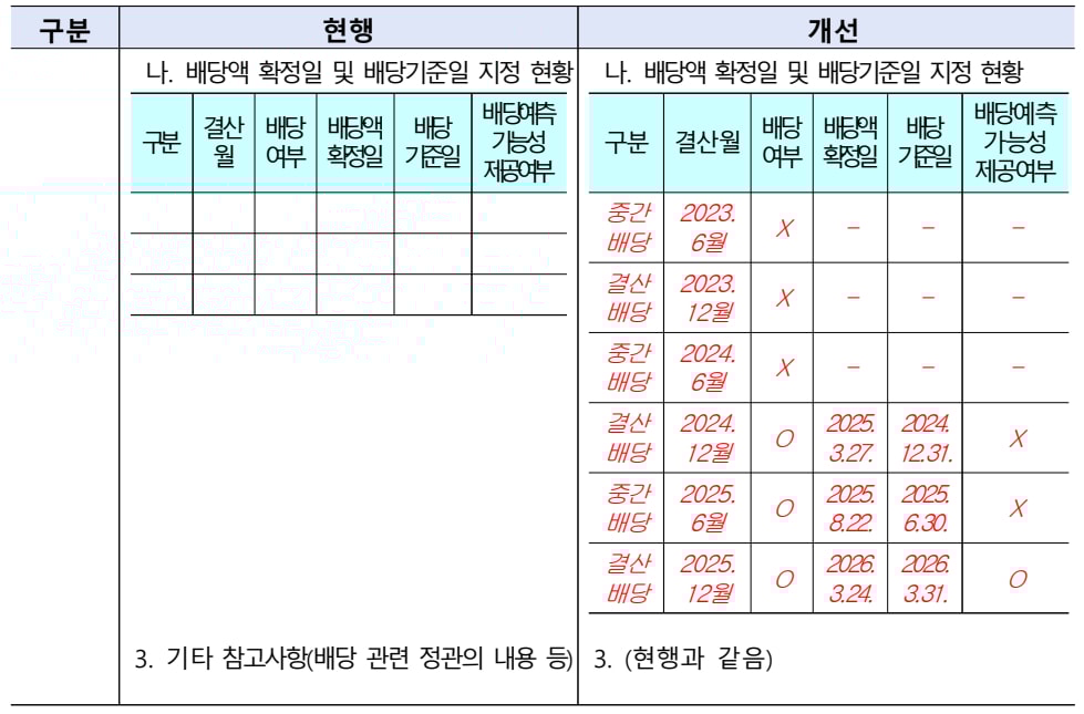 이를 위해 상법 유권해석 및 기업별 정관개정을 통해 주주총회 의결권 기준일과 배당기준일을 분리하고, 배당기준일을 주총 이후로 정할 수 있도록 했다. 2024년말에는 자본시장법을 개정해 배당기준일을 3·6·9월말로 규정한 부분을 삭제했다. 이에 따라 2025년부터는 분기배당도 배당액 확정 이후로 배당기준일을 지정할 수 있게 됐다.