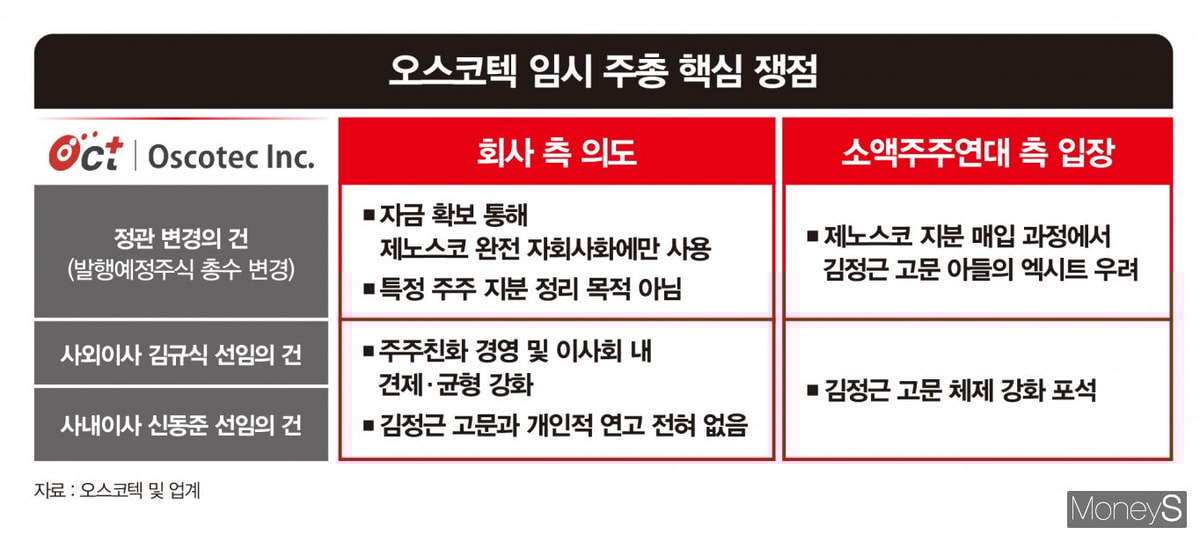 오스코텍과 소액주주들이 임시 주주총회에서 충돌할 전망이다. 지난 3월 정기 주총에서 대표이사 교체를 이끈 소액주주들은 이번 임시 주총에서도 오스코텍이 제안한 안건에 반대 의견을 낼 것으로 관측된다. 오스코텍은 주주들을 설득하기 위해 간담회 등을 진행했으나 주주들의 신뢰를 회복하지 못했다는 평가다.