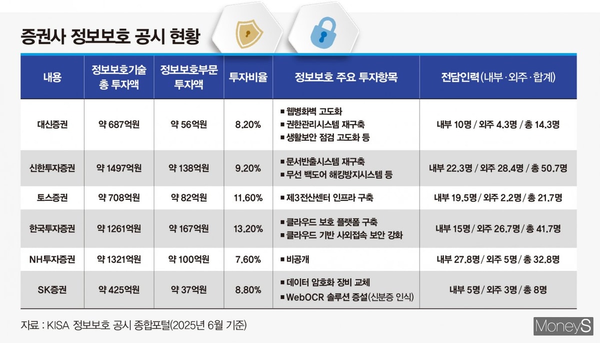 업체별로 정보보호 공시현황(2025년 6월 기준)을 살펴보면 대신증권의 정보보호기술 총 투자액은 약 687억원이고 정보보호부문에는 8.2%인 약 56억원을 썼다.