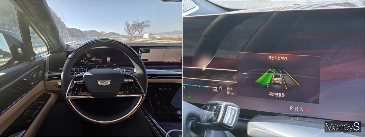 가장 먼저 체감한 기능은 국내 최초로 적용된 '슈퍼크루즈'다. 고속도로에 진입하자 스티어링 휠 상단 라이트바가 녹색으로 점등되며 핸즈프리 주행이 활성화됐다. GM은 이 기능을 위해 국내 약 2만3000㎞ 구간을 라이다로 직접 스캔해 지도를 구축했다. 시스템은 차간 거리와 속도 흐름을 읽어 차선을 스스로 유지했고 느린 차량을 만나면 먼저 차선 변경을 제안했다. 운전자가 방향지시등을 작동해 슈퍼크루즈 중 차선 변경을 지시할 수도 있다.