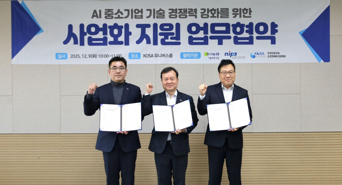 기술보증기금은 9일 한국인공지능·소프트웨어산업협회(KOSA) 본사에서 정보통신산업진흥원(NIPA), KOSA와 '인공지능(AI) 중소기업 기술 경쟁력 강화를 위한 사업화지원 업무협약'을 체결했다고 밝혔다.