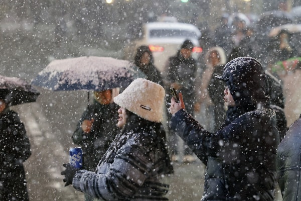 오는 10일은 전국에 구름이 많다가 밤부터 흐려지겠다. 사진은 첫눈이 내린 지난 4일 오후 서울 중구 명동을 찾은 관광객들이 내리는 눈을 맞으며 즐거운 시간을 보내고 있는 모습. /사진=뉴스1