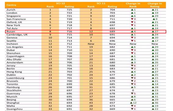 부산시는 영국 컨설팅 기관 지옌사(Z/Yen)가 발표한 제12회차 세계 스마트센터지수(SCI) 평가에서 전 세계 77개 주요 도시 중 8위를 차지했다고 10일 밝혔다. 이는 국내 1위 기록이자 아시아에서는 싱가포르(3위)에 이어 두 번째로 높은 순위다.
