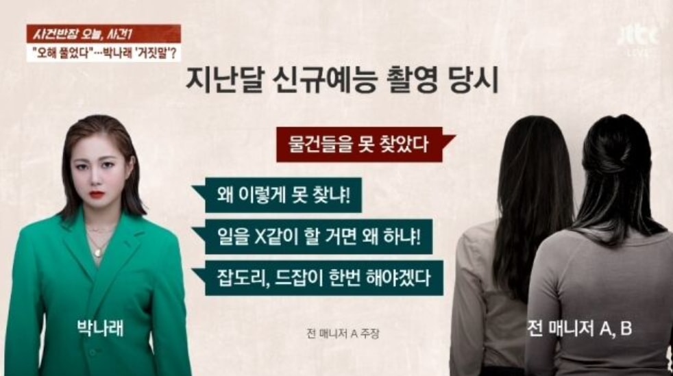 지난 10일 방송된 JTBC '사건반장'에서는 박나래 사건과 관련 전 매니저 A씨의 주장을 보도했다. 이날 양원보 앵커는 "우리와 연락이 닿은 전 매니저 A씨는 박나래에 대한 애정과 존경하는 마음도 있었다고 한다. 그랬던 A씨가 퇴사와 폭로를 결심하게 된 계기가 있었다"며 "(A씨가 박나래에게) '일을 X같이 할 거면 왜 하냐'라는 말을 들었던 모양"이라고 말했다.