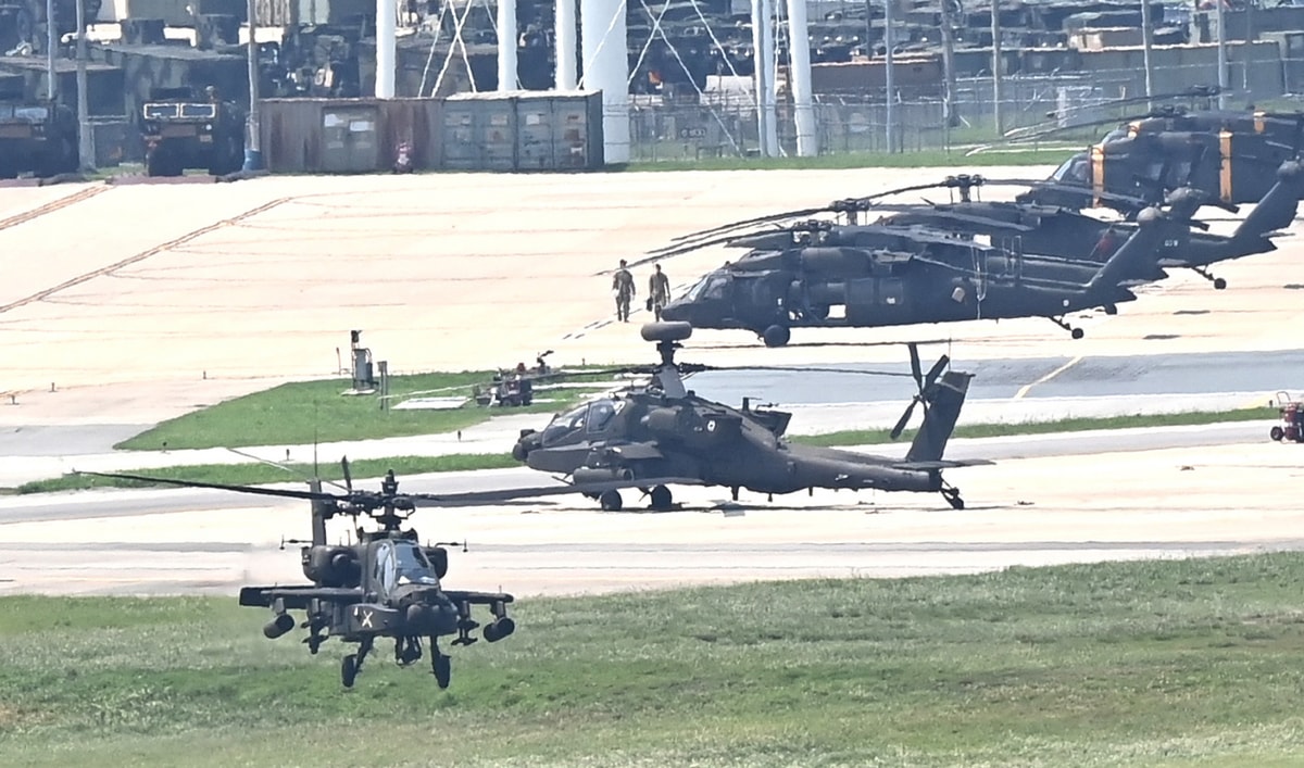 미국 하원에서 주한미군 규모를 현 수준으로 유지하는 내용이 포함된 2026 회계연도 미국 국방수권법안(NDAA)을 통과시켰다. 법안은 미 상원으로 넘어간다. 사진은 한미 연합훈련 을지 자유의 방패(UFS·을지프리덤실드) 연습이 시작된 지난 8월18일 경기 평택시 주한미군기지 캠프 험프리스에서 아파치 헬기가 이륙한 모습. /사진=뉴시스