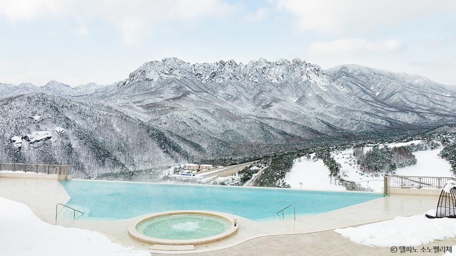 설악산의 아름다운 풍광과 어우러진 리조트로 자연 속에서 여유를 찾을 수 있는 곳으로 이스트타워 11층에 위치한 인피니티풀에서 온천을 즐길 수 있다. 눈 내린 겨울, 하얗게 덮인 설산과 푸른 온천수가 어우러진 풍경은 마치 한 폭의 수묵화 속에 들어와 있는 듯한 착각을 일으킨다.