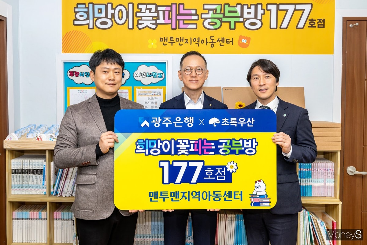 임양진 광주은행 부행장(가운데)은 최근 '희망이 꽃피는 공부방' 177호점으로 선정된 광주 서구 맨투맨지역아동센터에 학습환경 개보수 비용을 전달하고 있다/사진=광주은행 제공.