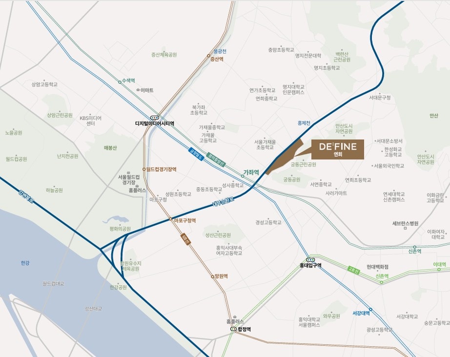 단지 인근에는 경의중앙선 가좌역이 있다. DMC역과 홍대입구역이 각각 한 정거장 거리에 위치해 있다. 연희초, 서연중, 경성중, 경성고,가재울고 등 초·중·고가 인접해있다. 홈플러스, 이마트, 신촌 세브란스 병원 등 생활 편의시설 이용도 편리하다.