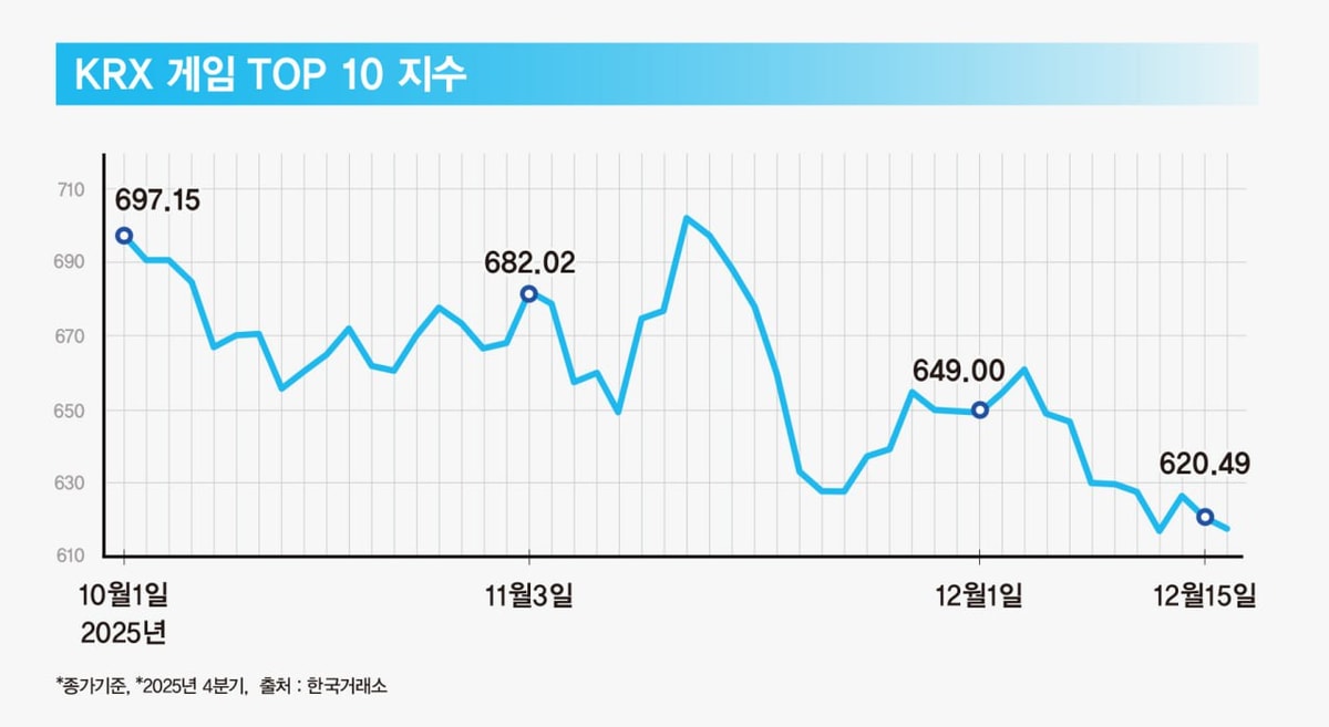 한국거래소 주요 테마 지수 가운데 'KRX 게임 TOP 10' 지수만은 올해 유일하게 마이너스 수익률을 기록했다. 해당 지수는 크래프톤·엔씨소프트 등 국내 주요 게임사 10곳으로 구성돼 산업 투자 심리를 가늠하는 바로미터 역할을 하지만 10월 1일 697.15포인트에서 이달 15일 620.49포인트로 11% 가까이 하락했다. 같은 기간 코스피와 코스닥이 각각 10% 넘게 치솟은 것과는 대조적으로 역(逆)수익률을 기록했다.