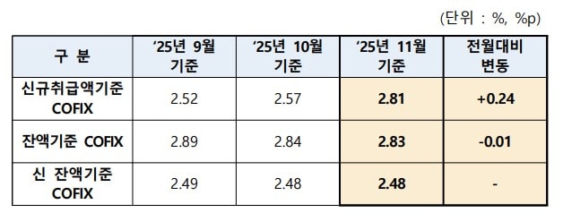 15일 은행연합회에 따르면 지난 11월 신규 취급액 기준 코픽스는 10월(연 2.57%)보다 0.24%포인트 상승한 2.81%로 집계됐다. 다만 잔액 기준 코픽스는 2.84%에서 2.83%로 0.01%포인트 낮아졌다. 신 잔액 기준은 2.48%로 전월과 같은 수준을 유지했다.