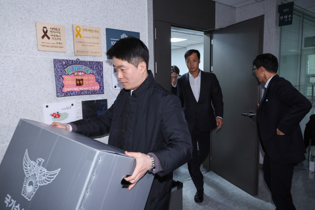 경찰이 지난 15일 전재수 전 해양수산부 장관을 압수수색에서 통일교가 보낸 것으로 추정되는 초청장을 확인했다고 전해졌다. 사진은 지난 15일 서울 여의도 국회 의원회관에 마련된 전 전 장관 의원실에서 경찰 수사관들이 압수수색을 마친 모습. /사진=뉴스1