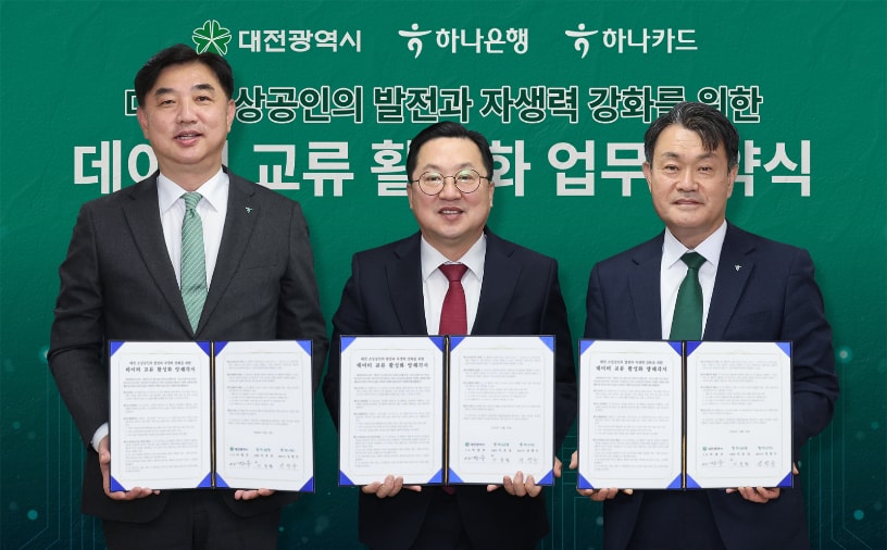 하나은행과 하나카드가 지난 16일 대전광역시 함께 데이터 교류 활성화를 위한 업무협약을 체결하고 지역사회 발전 및 소상공인의 자생력 강화를 위해 상호 협력키로 했다고 17일 밝혔다.