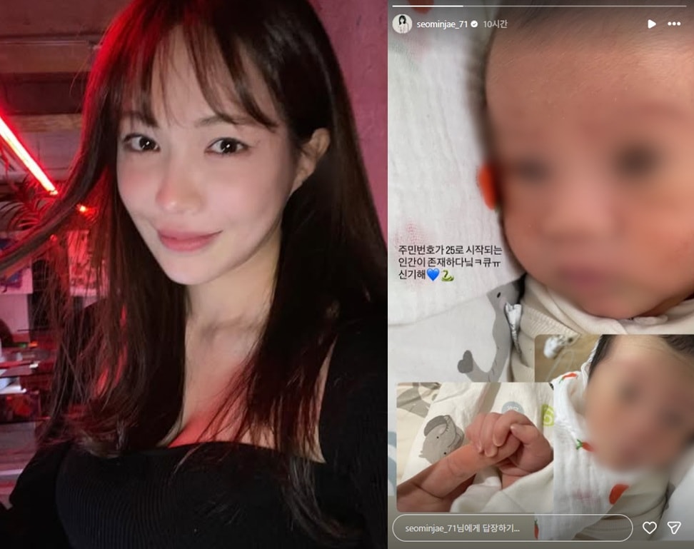서민재는 지난 17일 자신의 인스타그램을 통해 "주민번호가 25로 시작되는 인간이 존재하다니 신기해"라는 글과 함께 사진을 게재했다. 공개된 사진 속에는 서민재를 빼닮은 짙은 쌍꺼풀 등의 또렷한 이목구비를 자랑했다. 또 엄마 서민재의 손가락을 잡고 있는 모습에 귀여움을 자아냈다.