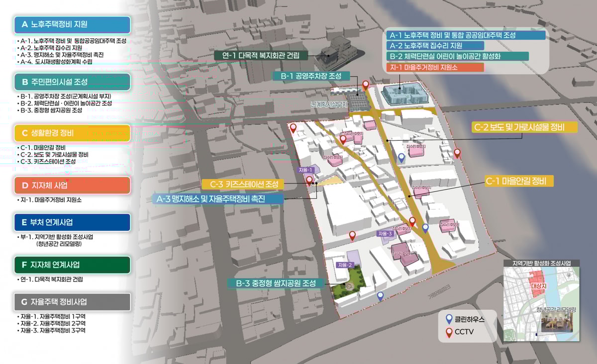 노후주택 정비 분야에서는 안전등급 D등급인 준일빌라 등 노후 공동주택을 철거한 뒤 통합공공임대주택 64세대를 조성해 주거 취약계층의 주거 안정을 도모한다. 이와 함께 개별 노후주택에 대한 집수리 지원을 병행하고, 맹지 해소 등 토지 이용의 불합리를 개선해 주민 주도의 자율주택정비를 촉진한다. 군은 장기적 관점에서 노후 주거지 개선과 지역경제 활성화를 아우르는 도시재생 활성화 계획도 수립할 예정이다.