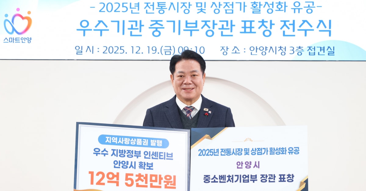 안양시가 중소벤처기업부 '전통시장·상점가 활성화 유공 포상'에서 우수 지자체로 선정돼 중소벤처기업부 장관 표창을 수상했다고 19일 밝혔다.