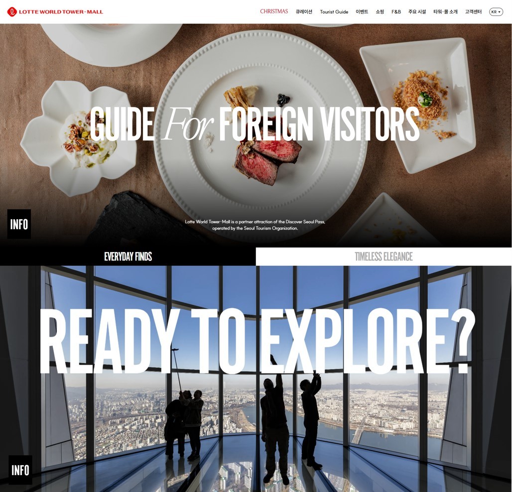 롯데물산은 롯데월드타워·몰 공식 웹사이트를 개편하며 다양한 콘텐츠와 즐길 거리를 보다 쉽게 전달할 수 있도록 설계했다. 타워 이미지를 인터페이스의 일환으로 만들어 3D 상호작용을 통해 위치와 교통 수단별 접근 정보를 생동감 있으면서도 직관적으로 전달할 수 있도록 만들었다. 볼드한 이미지 중심 레이아웃과 간결한 폰트를 활용해 디자인 트렌드를 타지 않고 몰입감 있는 비쥬얼을 제공한다.