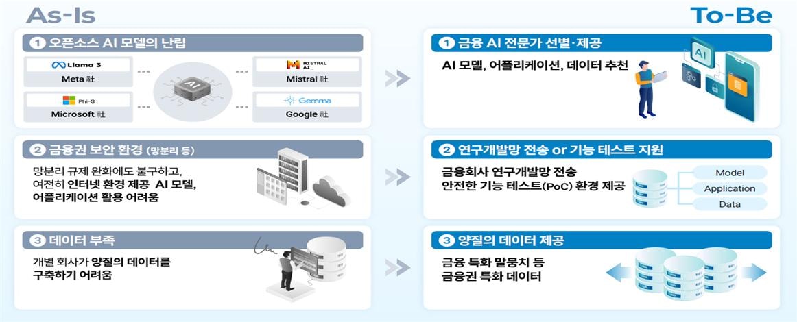 일환으로 신용정보원은 금융회사 대상 'AI 플랫폼'과 금융소비자 대상 'AI 러닝 플랫폼'을 공개했다. AI 플랫폼은 AI 투자여력이 부족한 중소형 금융사, 핀테크기업 등이 쉽고 안전하게 AI에 접근할 수 있도록 AI 전문가가 추천한 금융권에 가장 적합한 AI 모델, 어플리케이션, 데이터를 선별·제공한다.