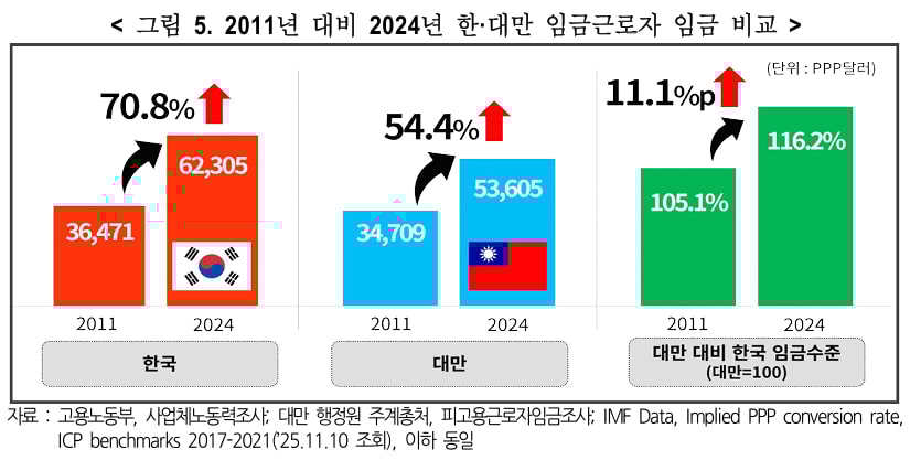 대만과의 비교에서도 유사한 흐름이 나타났다. 한국 임금근로자의 연 임금총액은 6만2305달러로 대만(5만3605달러)보다 16.2% 높았다. 제조업 임금은 한국이 7만2623달러로 대만 대비 25.9% 높은 수준이었다. 시장환율 기준으로는 격차가 확대돼 제조업 임금은 70% 이상 차이가 났다.