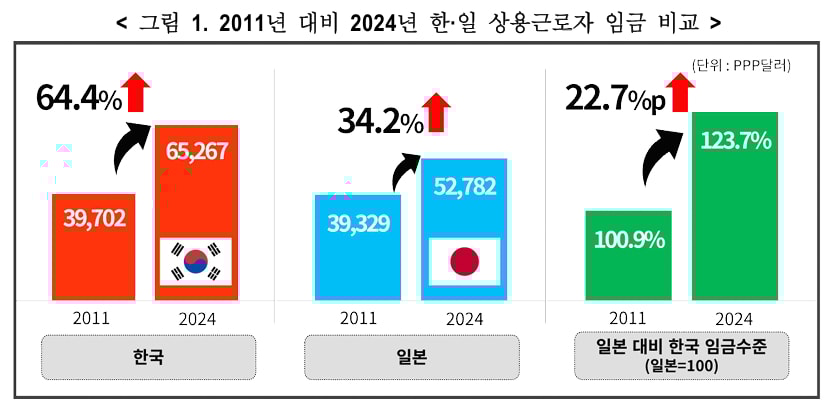 '한·일·대만 임금 현황 국제비교와 시사점' 보고서에 따르면 한국 상용근로자의 연 임금총액은 6만5267달러로 일본(5만2782달러)을 23.7% 웃돌았다. 2011년에는 양국 임금 수준이 유사했으나 이후 한국의 임금 인상률이 일본보다 크게 나타나면서 격차가 확대됐다. 2011~2024년 한국 임금은 64.4% 상승한 반면 일본은 34.2% 인상에 그쳤다.