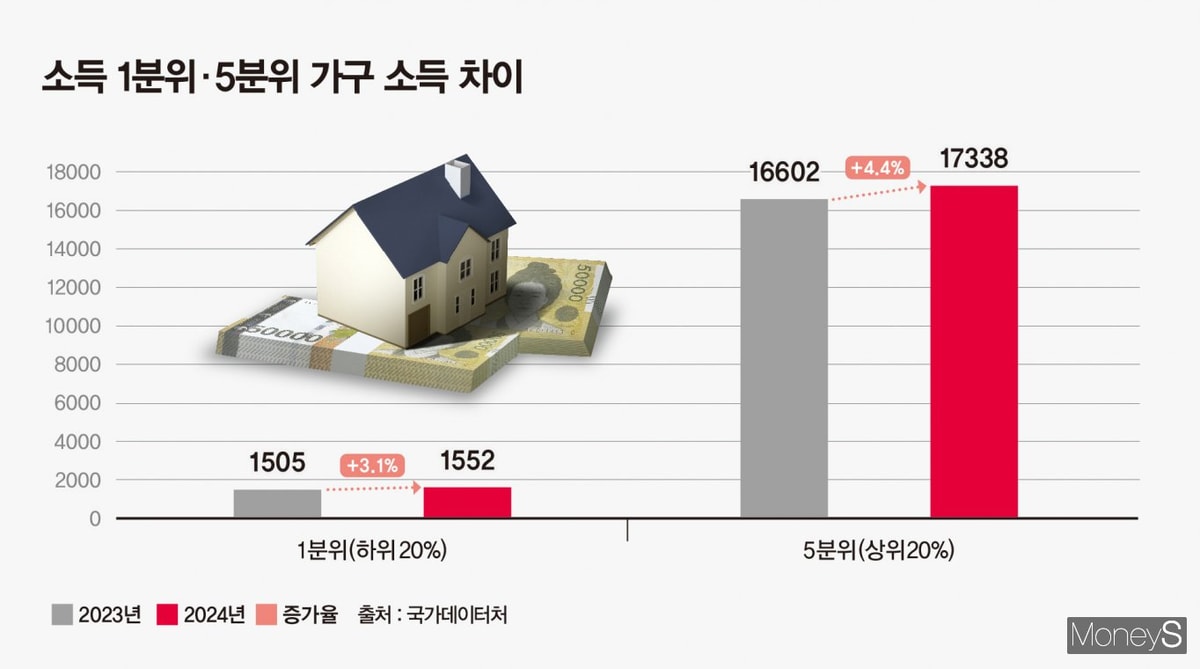 국가데이터처는 최근 '2025년 가계금융복지조사 결과'를 통해 2024년 기준 소득상위 20%에 해당하는 5분위 가구의 평균소득은 1억7338만원으로 전년대비 4.4% 늘어난 반면 하위 20%인 1분위는 3.1% 증가에 그쳤다고 분석했다. 상·하위 20% 소득 격차를 보여주는 소득 5분위 배율도 5.72배에서 5.78배로 높아지며 3년 만에 증가세로 돌아섰다.지난 5년 간의 흐름을 보면 상·하위 계층간 K자형 양극화 현상은 더욱 두드러진다. 국회 기획재정위원회 소속 최기상 의원(더불어민주당·서울 금천)에 따르면 소득 상위 20% 가구의 월평균 소득은 2020년 911만원에서 2025년 1074만원으로 163만원 증가한 반면 하위 20%는 같은 기간 103만원에서 119만원으로 16만원 증가하는 데에 그쳤다. 이 기간 일상생활에 필요한 소비지출을 뺀 흑자액은 5분위가 월 평균 330만원 흑자를 기록한 데 비해 1분위는 평균 약 30만원의 적자를 냈다.