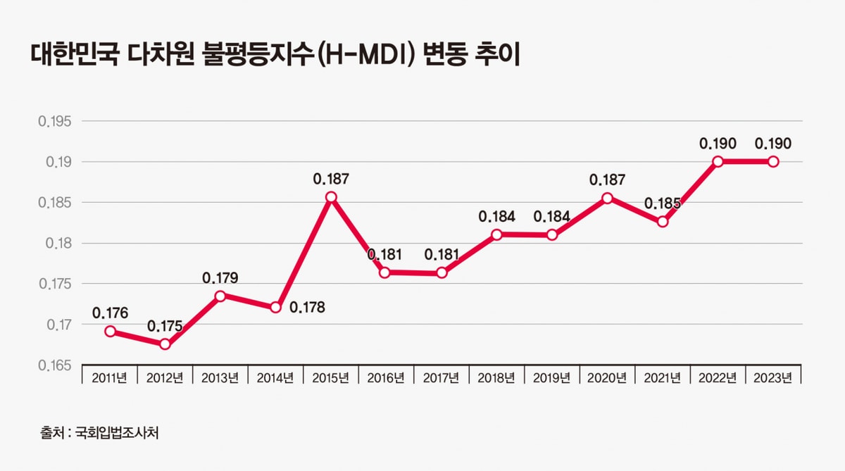 자산과 소득 모두에서 상·하위 간 격차가 명확해진 점은 K자형 양극화 심화다. 부의 양극화는 교육, 건강 등 다양한 사회적 불평등으로도 이어진다.국회입법조사처가 한국보건사회연구원 복지패널을 이용해 소득·자산·교육·건강 측면을 모두 고려한 다차원 불평등 지수(H-MDI)를 산출한 결과 2011년 0.176에서 2023년 0.190으로 상승해 전반적 불평등이 심화된 것으로 분석됐다.