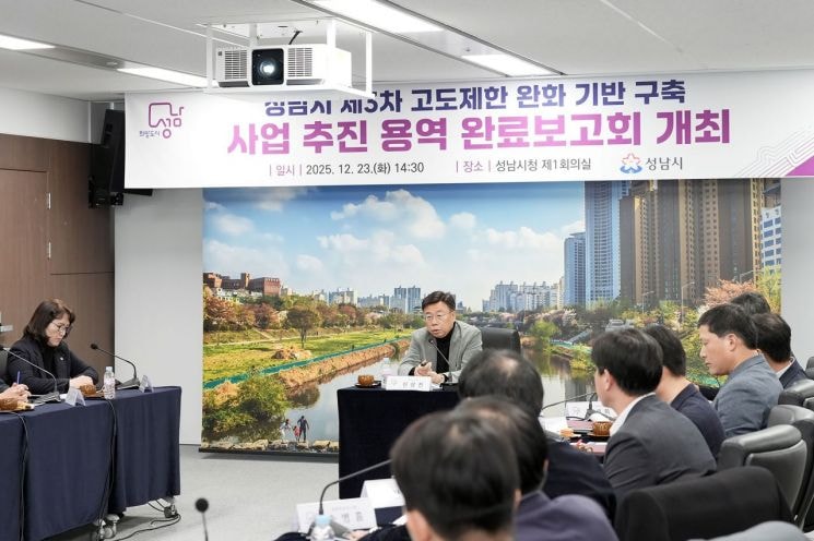 시는 23일 오후 시청 제1회의실에서 '제3차 고도제한 완화방안 기반 구축 사업' 연구용역 완료보고회를 열고 향후 추진 방향을 논의했다고 24일 밝혔다. 이날 보고회에는 신상진 시장과 성남시의회, 관계 부서장, '성남시 고도제한 완전해결을 위한 범시민대책위원회' 관계자 등이 참석했다.