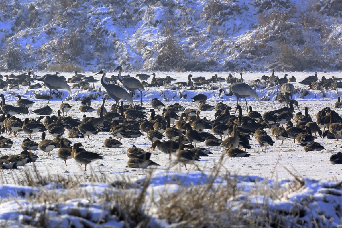 장항습지에서 겨우살이하는 재두루미와 기러기. /사진제공=고양특례시
