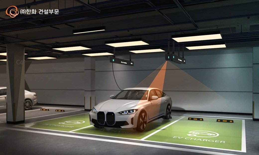 한화 건설부문이 개발한 EV 에어스테이션은 천장에서 커넥터가 자동으로 내려오는 전기차 충전시스템이다. 지능형 전력 분배 기술을 적용해 하나의 충전기로 차량 3대를 동시에 충전할 수 있어 공간 효율성과 이용 편의성을 높였다.