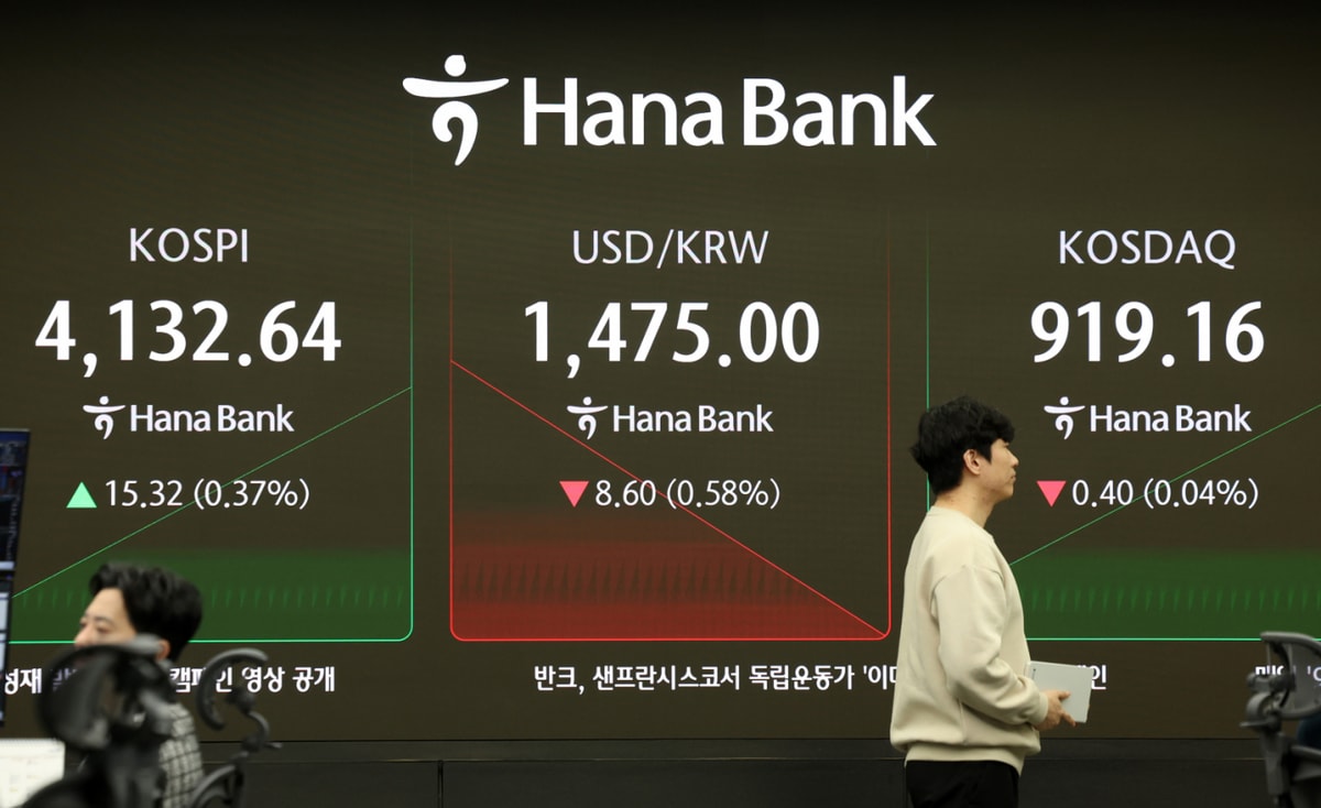 24일 오전 서울 중구 하나은행 딜링룸 전광판에 지수가 표시되고 있다./사진=뉴시스