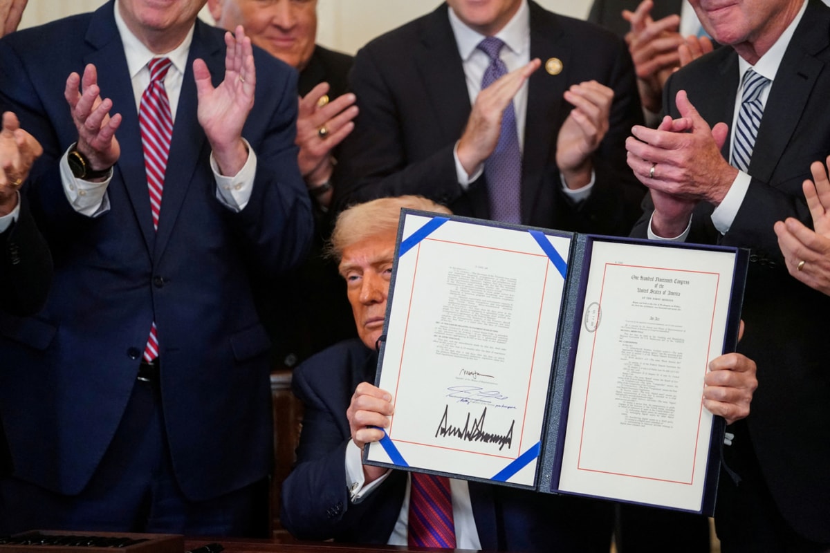 7월18일(현지시각) 도널드 트럼프 미국 대통령이 달러 기반 스테이블 코인의 법제화를 담은 지니어스 법에 서명했다. 사진은 지니어스 법에 서명 후 법률안을 들어보이는 트럼프 대통령. /사진=로이터