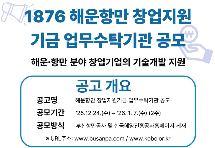 한국해양진흥공사는 부산항만공사(BPA), 부산광역시, 코리아스타트업포럼과 공동 운영 중인 해운항만 창업지원 플랫폼 '1876 Busan'의 기능을 전면 고도화하고 2026년 2단계 사업을 이끌어갈 전문 위탁운영기관을 공개 모집한다고 24일 밝혔다.