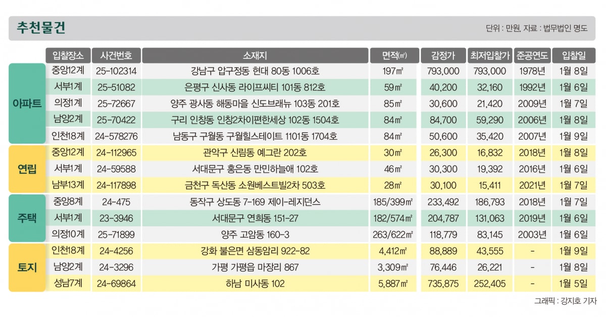 감정가 7억9200만원에서 한 차례 떨어져 6억3360만원에 매각이 진행된다. 등기부 등본상 근저당 3건, 가압류 2건 등은 매각 후 잔금 납부 시 소멸된다. 소유자가 거주하고 있어 매각 시 인도부담이 적다. 시세는 7억5000만원에서 8억2000만원에 거래되고 전세가는 5억원에서 5억5000만원 선이다. 매각일자는 2026년 1월 8일 서울중앙지방법원 경매 12계다. 사건번호 24-115735