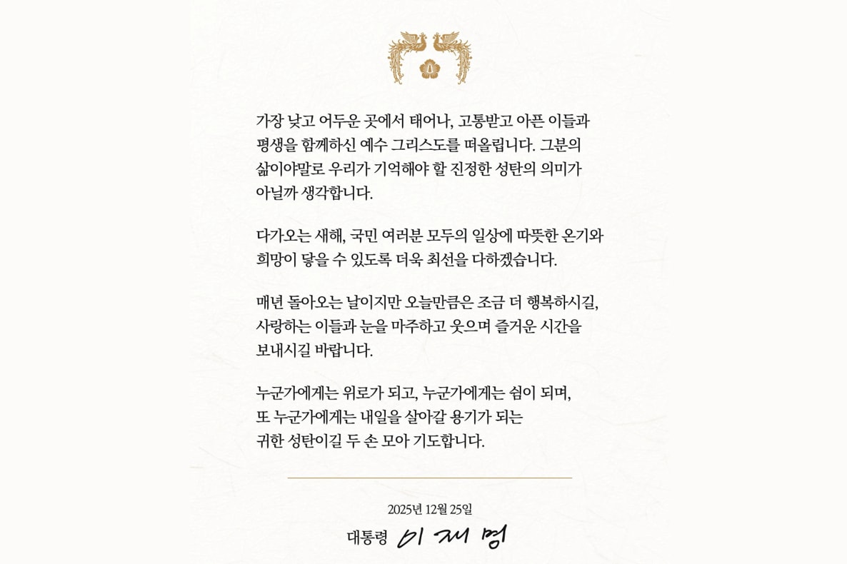 이재명 대통령이 성탄절을 맞아 소셜미디어(SNS)에서 축하 메시지를 전했다.