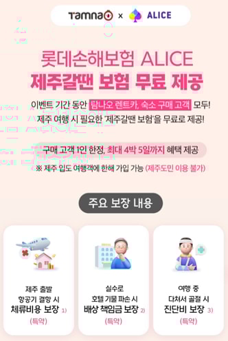 롯데손해보험이 제주 여행 공공플랫폼 '탐나오'와 제휴를 맺고 제주 숙박·렌터카 예약 고객에게 '제주갈 땐 보험' 무료 가입 혜택을 제공한다고 26일 밝혔다.