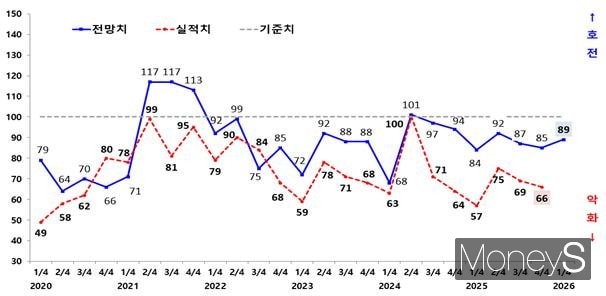29일 광주상공회의소가 광주지역 120개 제조업체를 대상으로 조사한 '2026년 1분기 기업경기실사지수(BSI)' 결과에 따르면 광주 BSI는 '89'로 집계됐다. 이는 전분기(85) 대비 4포인트 상승했지만 2024년 2분기(101) 이후 7분기 연속 기준치를 밑도는 것이다.