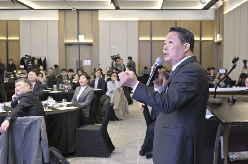 최영일 순창군수가 29일 코트야드 세종 호텔에서 열린 '농어촌 기본소득 시범사업 성과창출 협의체 출범식'에서 순창형 기본소득 모델을 소개하고 있다./사진제공=순창군