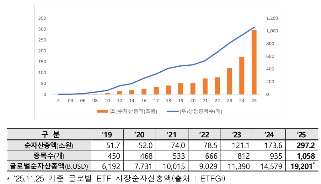 30일 한국거래소가 발표한 '2025년 ETF·ETN 시장 결산 및 주요 특징 분석'에 따르면, 올해 말 기준 국내 ETF 시장의 순자산총액은 297조 2000억 원으로 집계됐다. 이는 전년(173조 6000억 원) 대비 무려 71.2% 성장한 수치로, 글로벌 ETF 시장 성장률(31.7%)을 2배 이상 상회하는 기록이다.