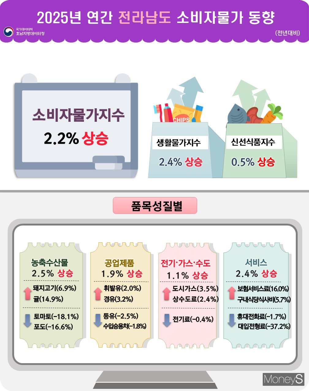 전남 연간 소비자물가도 2021년(2.6%), 2022년(5.7%), 2023년(3.5%), 2024년(2.5%)에 이어 5년만에 최저치다.