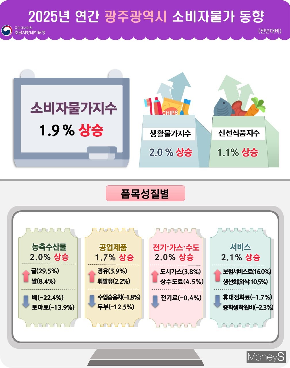 31일 호남지방데이터청이 발표한 '2025년 12월·연간 광주전남 소비자물가동향'에 따르면 연간 광주 소비자물가지수 상승률은 1.9%로 지난해(2.5%)보다 0.6%포인트가 하락했다.