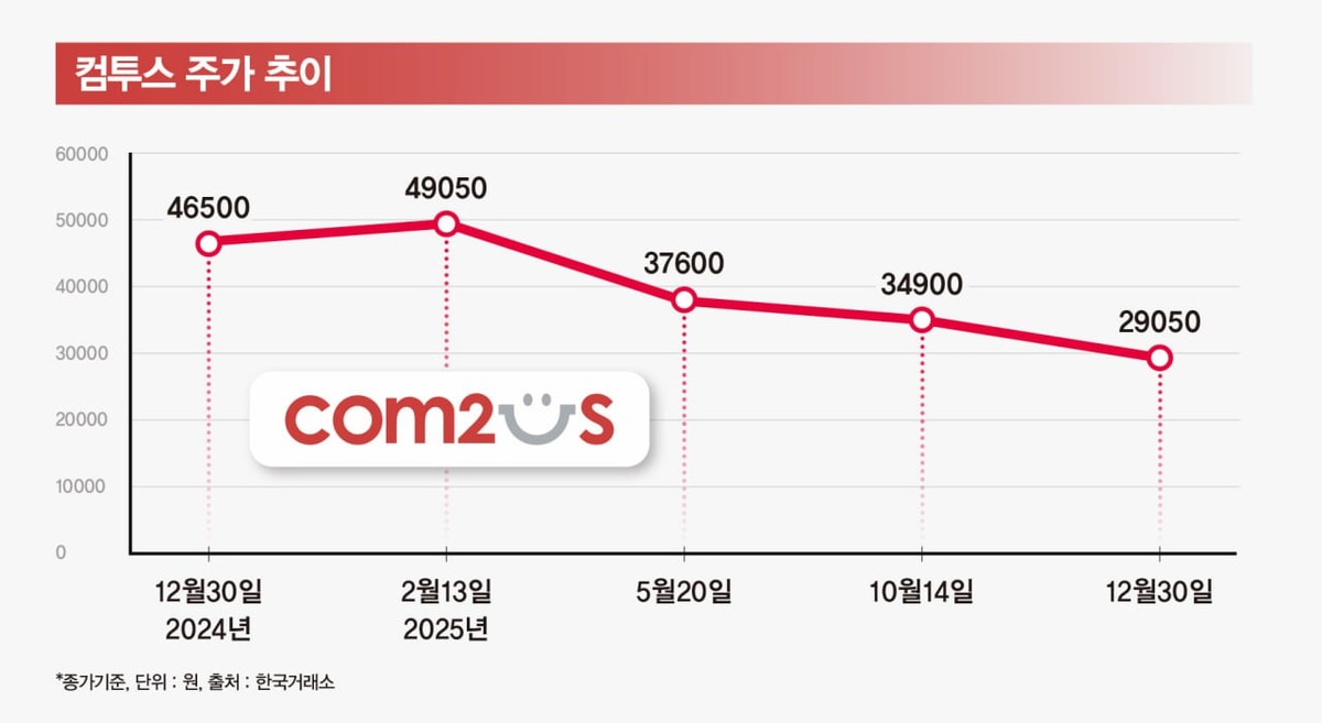 컴투스 주가는 2024년 12월 30일 종가 4만6500원으로 시작해 올해 2월에는 장중 5만2000원까지 올랐지만 2025년 12월 30일에 2만9050원으로 내려 1년 새 약 37.5% 떨어졌다.