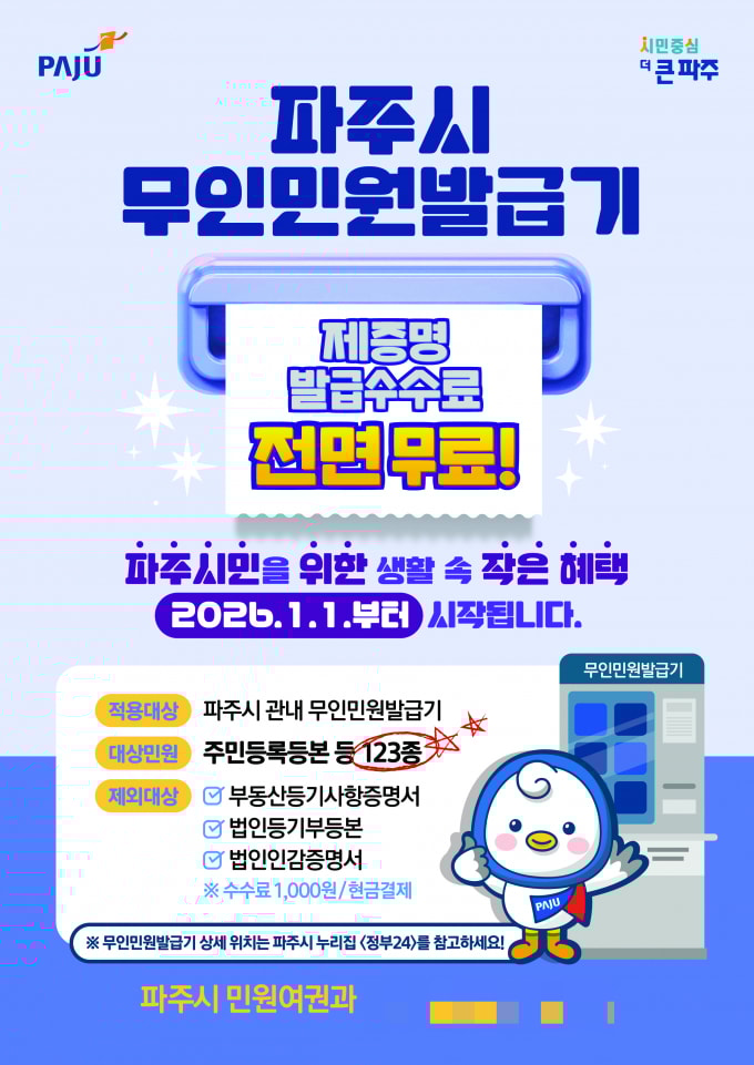 파주시가 시민들의 비용 부담을 줄이고 생활 편의를 높이기 위해 지난 1일부터 관내 무인민원발급기에서 발급되는 제증명 수수료를 전면 무료화한다고 2일 밝혔다.