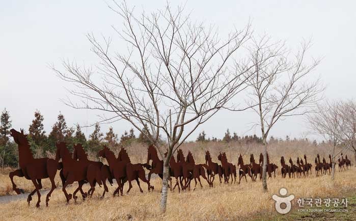 600년 목축문화가 살아 숨 쉬는 표선면 중산간의 가시리마을에 위치한 제주의 대표적인 말 테마 명소다. 조선시대 최고의 말을 사육했던 갑마장이 있던 곳으로 드넓은 초지와 오름이 어우러져 예부터 최적의 말 방목지로 꼽혀왔다. 붉은 말의 해를 맞아 제주의 자연 속에서 역동적인 기운을 만끽하며 한 해를 시작하기에 더할 나위 없는 장소다.