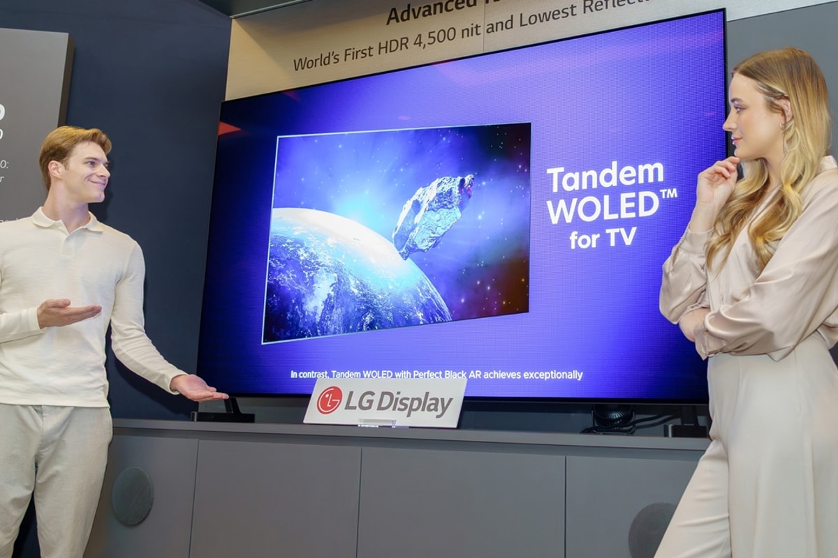 콘래드 호텔에 마련한 대형 OLED 전시 부스에서 새로운 OLED TV 패널을 선보인다. 빛의 삼원색(적·녹·청)을 각각 독립된 층으로 쌓아 빛을 내는 LG디스플레이 독자기술 '프라이머리 RGB 탠덤'을 한 단계 더 발전시킨 '프라이머리 RGB 탠덤 2.0'을 적용한 게 특징이다. 여기에 더욱 정교해진 픽셀 구조와 고도화된 알고리즘을 더해 빛 효율을 극대화했다.
