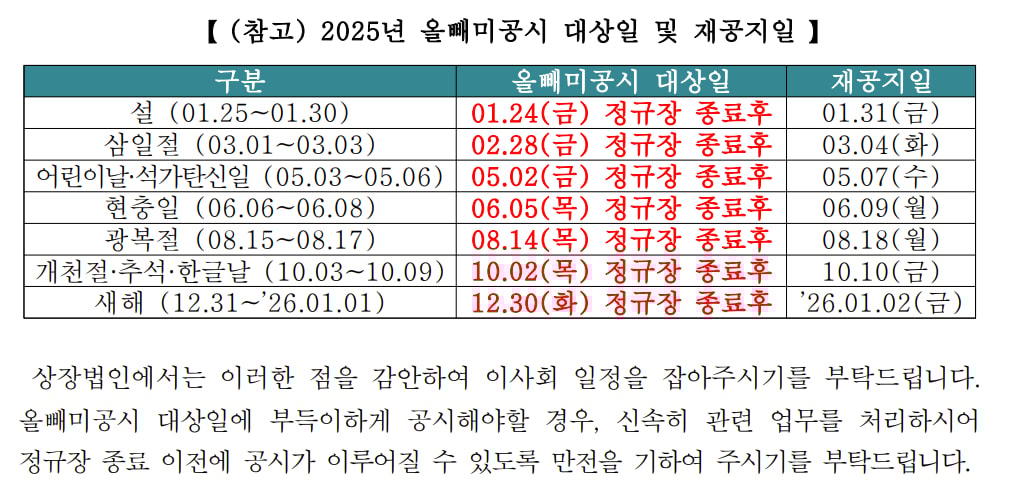 한국거래소는 올빼미 공시 대상일을 미리 지정한다. 이 기간 공시는 투자자 보호를 위해 휴장일 직후 첫 번째 매매일 하루 동안 기업공시 채널(KIND) 홈페이지 팝업으로 재공지된다. 2025년에는 ▲설날 연휴 ▲삼일절 ▲어린이날과 석가탄신일 연휴 ▲현충일 연휴 ▲광복절 연휴 ▲개천절·추석·한글날 연휴 ▲새해가 해당됐다. 대상은 이른바 수시공시로 불리는 주요 경영사항 공시다.
