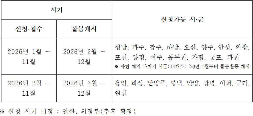 신청은 매월 1일부터 15일까지 경기민원24를 통해 온라인으로 가능한다. 돌봄활동 후 그다음 달에 수당을 지급한다. 시군별 준비 상황에 따라 신청·활동 시작 시점이 다르다.