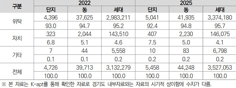 이 보고서에 따르면 도는 전국에서 공동주택 관리 수요가 가장 집중된 지역이다. 전국 공동주택 단지 25.7%, 동의 30.8%, 세대의 28.9%가 경기도에 위치하며, 지난 10년간 세대수는 무려 56.7% 증가(2025년 기준)해 다른 광역지자체보다 가파른 성장세를 보였다.
