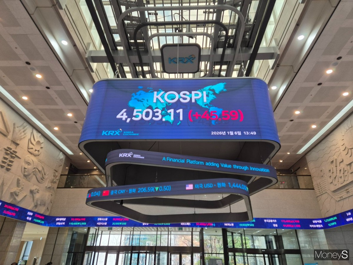 6일 한국거래소에 따르면 이날 오후 1시56분 코스피는 전 거래일 대비 38.03포인트(0.85%) 오른 4495.55에 거래된다. 이날 코스피는 장 중 최고 4506.26까지 오르며 사상 최고치를 달성했다.